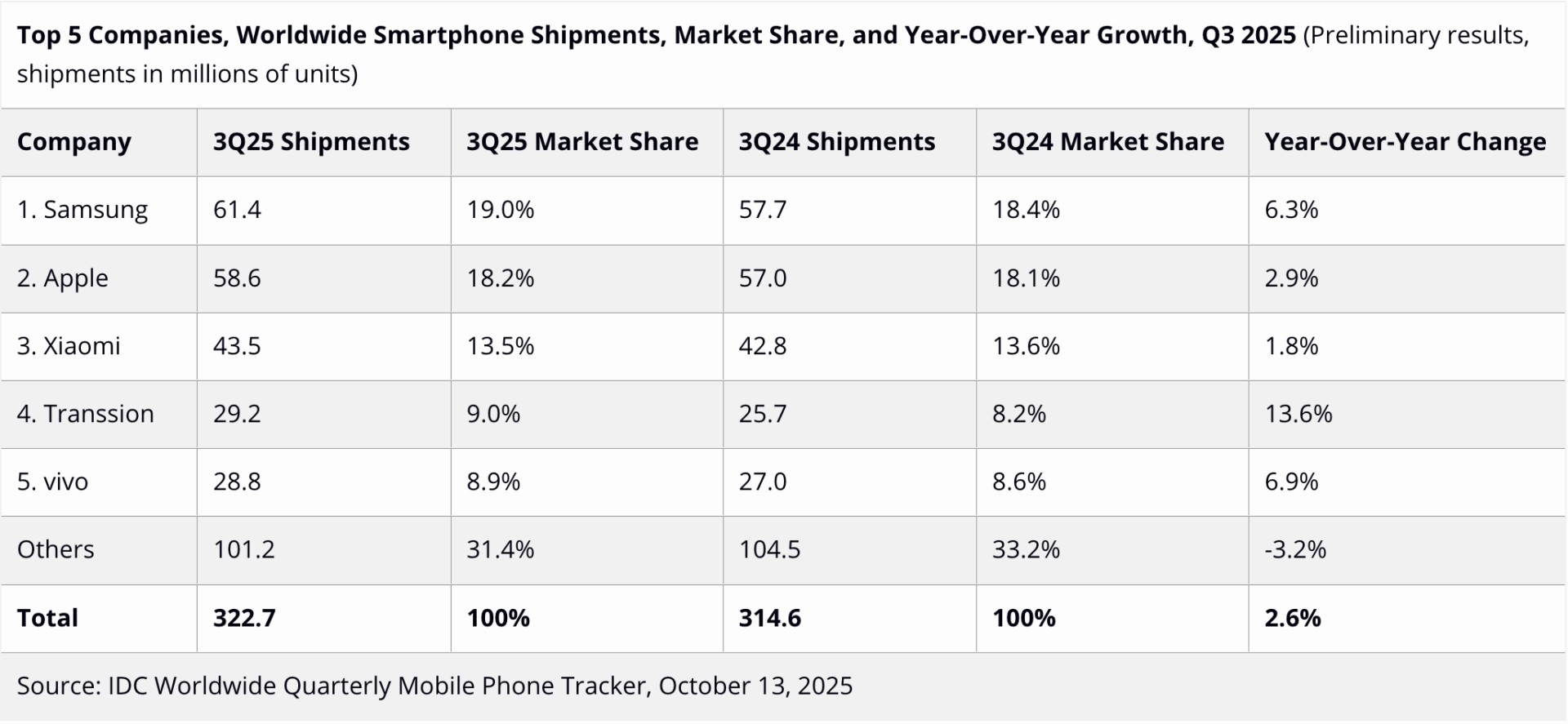 Samsung, geçtiğimiz senenin aynı dönemine göre satışlarını %6,3 arttırarak 61,4 milyon satış rakamına ulaştı ve %19 pazar payıyla ilk sıradaki yerini korudu. Apple ise satışlarını %2,9 arttırdı ve %18,2 payla ikinci sırada yer aldı. Xiaomi‘nin %13,5 pazar payıyla ile üçüncü sırada yer aldığı listede, en büyük yükselişi gerçekleştiren şirket Transsion oldu. Itel, Tecno ve Infinix gibi markaları bünyesinde barındıran şirket, özellikle Afrika pazarındaki büyümeyle satışlarını %13,6 arttırarak dördüncü sıraya yükseldi.